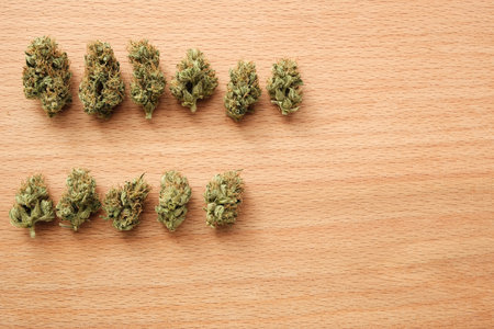 Marijuana outdoor wild buds in row on wooden background. Top view, close-up. Cannabis dried flowers. Weed stuff, legal CBD recreational use.