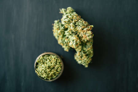 Macro of marijuana with trichomes and crushed weed in a grinder for chopping a canapis on a black table close up