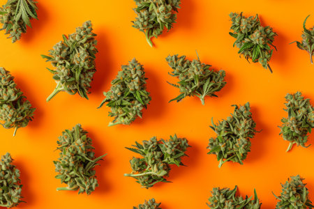 Overhead flat lay of dried cannabis marijuana buds on a bright color background