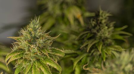 Flower bud of cannabis Satival in the greenhouse, marijuana flower bud background, herbal medicine. Concept of herbal alternative medicine, cbd hemp oil.