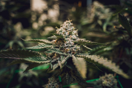 Up close view of mature Indoor recreational and medical marijuana industry plant with visible amber pistils and developing trichomes