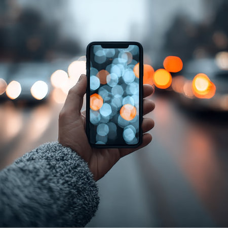 Stunning Nighttime Urban Scene of a Smartphone Capturing Bokeh Lights with City Life Vividly Alive