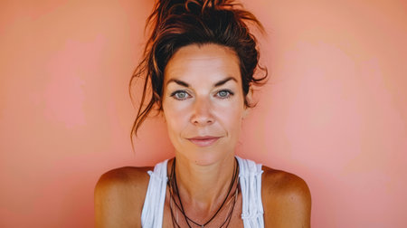 Close up of a confident middle aged woman with a peach copyspace background