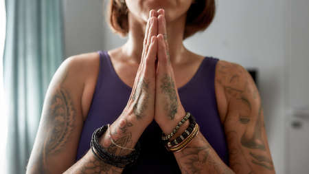 Close-up chest of a yoga trainer who holds in front of her joined palms in a prayer gesture in the gym