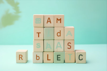 Unlocking Language: Exploring ABCs with Wooden Cubes on Pastel Green