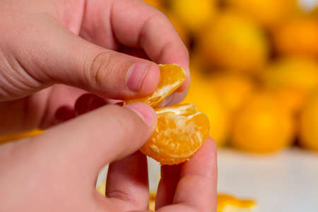 Close-up of boy hands that is eating a citrus fruit. Heap of orange tangerines at background