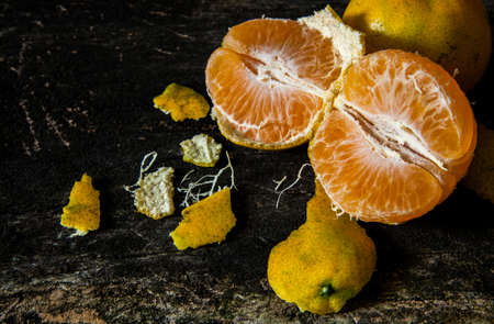 Orange fruit slice and peeled on wooden table background, Close up shot, Selective focus