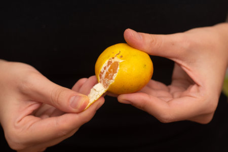 Peeling a Fresh Orange Mandarin. Female Hands skillfully exfoliating a juicy ripe mandarin