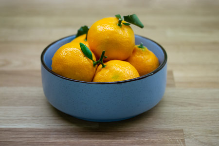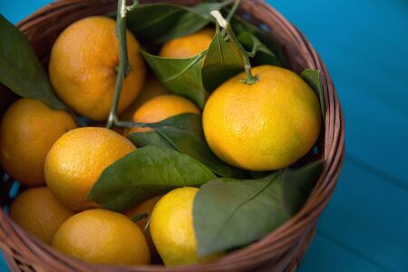 Blue bowl with mandarin oranges with green leaf. Ripe sour citrus fruit on a wooden table close-up