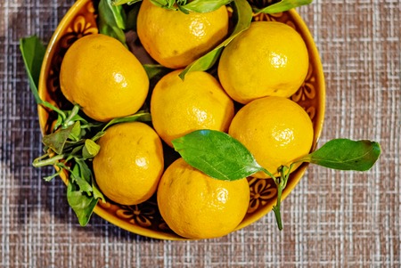 Tangerines (oranges, tangerines, clementines, citrus) with leaves in a ceramic plate