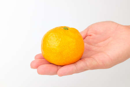 Tangerine in hand on a white background, copy space