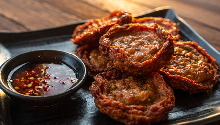 A plate of golden-brown Thai Tod Mun Pla fish cakes served with a flavorful sweet chili dipping sauce, perfect as an appetizer or snack.