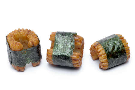 Sushi-shaped, small pastry pieces, wrapped with seaweed, seaweed, and a strong fishy taste