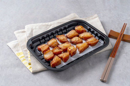pork roll frying in pan at the kitchen. it's unhealthy food that contain many of cholesterol and fat