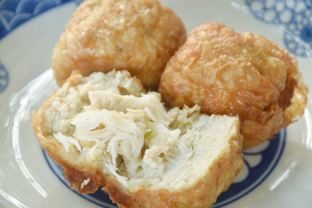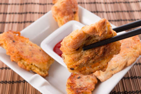deep fried mashed crab meat and pork roll Chinese food on plate dipping sweet plum sauce