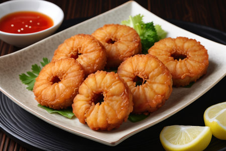 Fried squid rings with lemon and dipping sauce