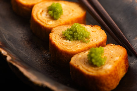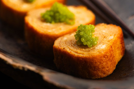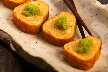 Japanese Tamagoyaki with Green Wasabi Caviar on Ceramic Stand