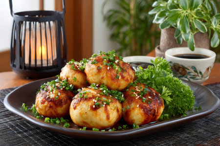 Tasty takoyaki topped with fresh chives on a serving plate