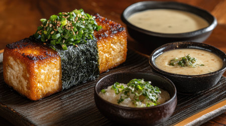 A visually appealing dish featuring grilled tofu topped with green onions and sesame, served with creamy and light dipping sauces, perfect for Asian cuisine lovers.