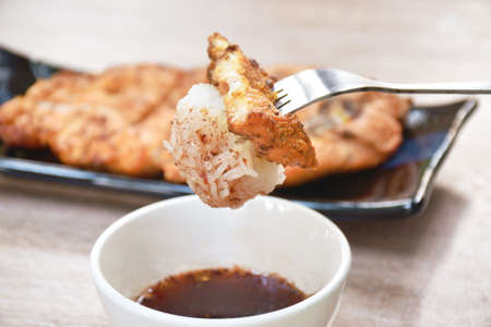 roasted slice chicken breast eat with sticky rice on plate stabbing by fork