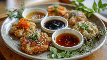 A beautifully arranged plate featuring a variety of freshly prepared Asian dishes accompanied by dipping sauces, garnished with vibrant herbs for a delightful dining experience.