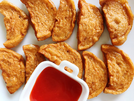 fried dumplings with tomato sauce on white background, top view