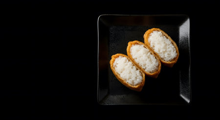 Three Inari Sushi pieces on a dark plate isolated against a black background with dramatic lowkey lighting and copy space