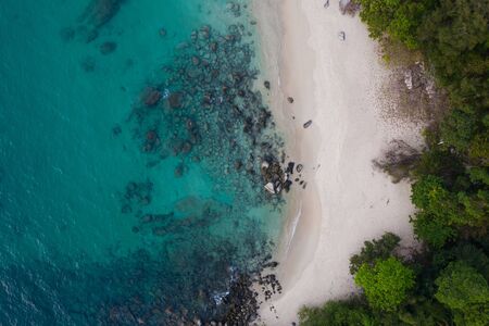 Aerial drone view of tropical empty beach with turquoise sea water and rocks