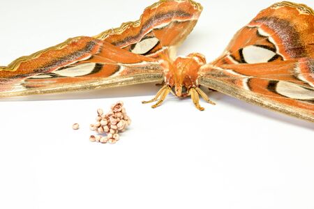 on an white table is an Attacus atlas whit her eggs