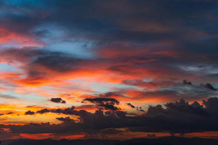 Red and orange dramatic colorful clouds lit by evening sunset light, sky landscape