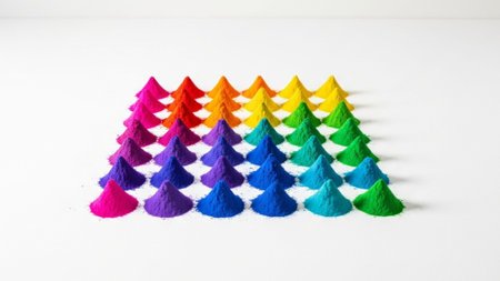 A stunning display of vibrant colors bursts across a dark background, creating a striking visual impact. Fine powders in shades of orange, yellow, green, blue, purple, and pink seem to explode outward, resembling a chaotic yet beautiful spectrum. The use of contrasting dark tones enhances the brightness of the colors, giving the impression of a lively celebration or artistic expression.
