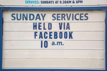 Church closed because of Coronavirus pandemic. Sign stating online Sunday service via Facebook.
