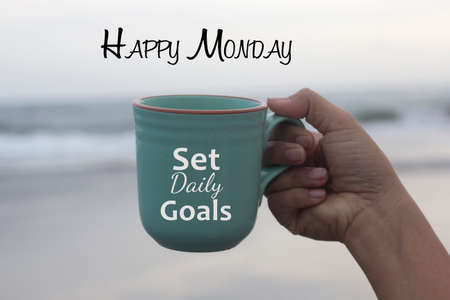 Happy Monday. Monday concept with business motivational text message on a coffee cup in hand - Set daily goals. Monday success inspirational quote.