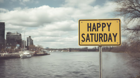 Happy Saturday Sign by the River, the letters stands near a riverside with mountains in the background. The scene captures a cheerful message, symbolizing relaxation and positivity