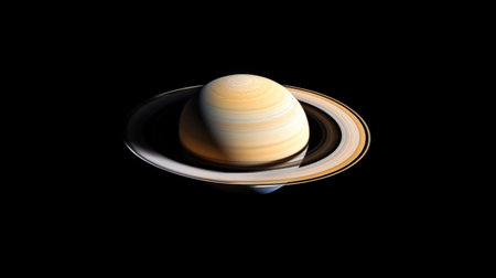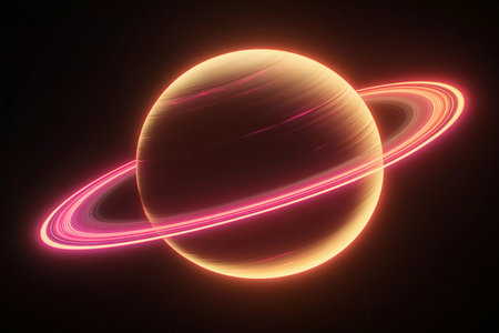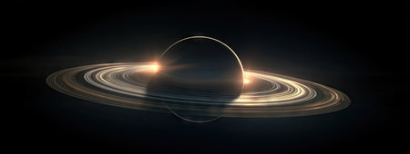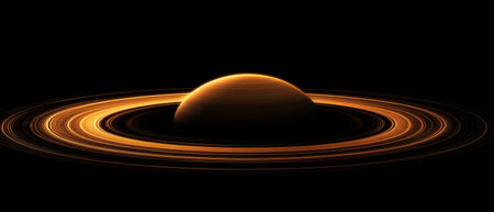 A celestial body with prominent rings is depicted against a black backdrop. The image features a spherical planet encircled by luminous rings with a gradient appearance. The composition emphasizes contrast and dimensionality. This imagery is suitable for various commercial purposes, including science and educational materials.