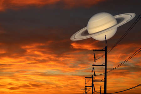 Saturn back on night cloud sunset sky silhouette power elecrtic pillar. concept Saturn near Earth