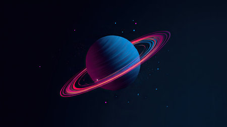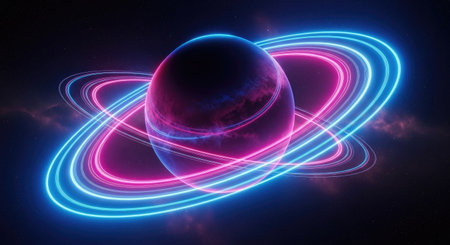 An artistic illustration presents a planet encircled by luminous neon rings, highlighted against a deep black backdrop. The scene uses gradients of blue and purple tones, suggesting a celestial environment. This conceptual design may be suitable for creative projects, digital art, or commercial applications related to space and technology.