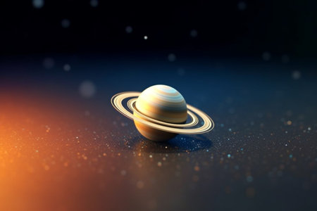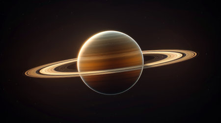 An artistic depiction of Saturn, a celestial body, is showcased. The image presents the planet surrounded by its prominent rings, bathed in subtle illumination. The composition suggests an outer space setting, perfect for various commercial and editorial uses. The dark background enhances the celestial subject's visual impact.
