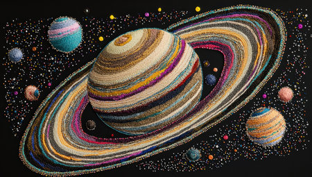 Colorful representation of the planet Saturn surrounded by abstract stars and planets, featuring vivid hues and intricate textures, ideal for space themed art