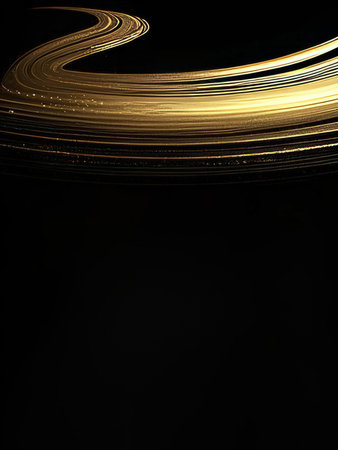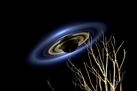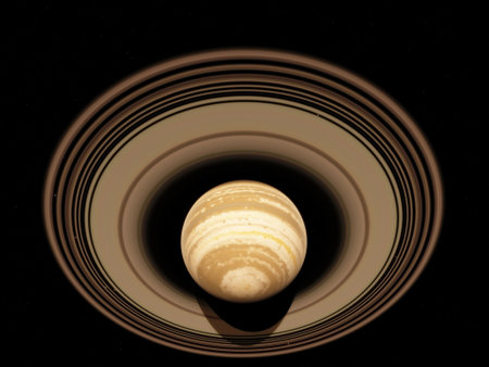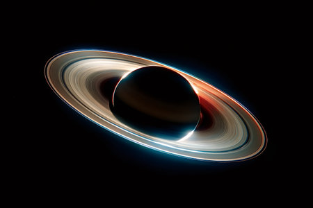 Saturn's iconic rings showcasing their immense scale and complex structure, glowing with vibrant celestial colors against the dark vacuum of space and the planet's dark, shadow draped surface