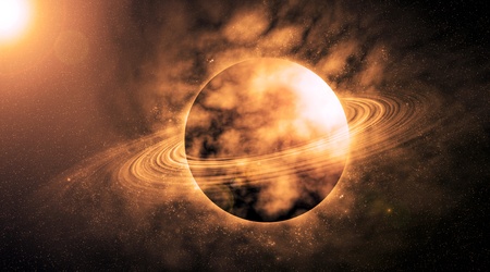 A massive planet orbits through space, adorned with striking rings that catch the light of a nearby star.