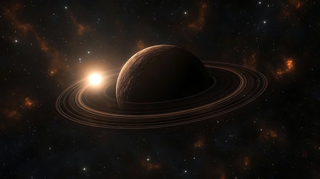 Saturn, a majestic gas giant, displaying its prominent and intricate ring system, reflecting light in the vast darkness of deep space, representing cosmic beauty and astronomical wonder