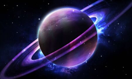abstract space illustration, 3d image, 3d rendering, background image, bright abstract planet with rings in the cosmic starry sky