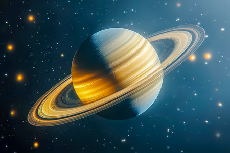 A luminous celestial body with a majestic ring structure orbits amidst countless twinkling stars in the dark expanse of space.