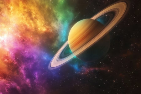 A colorful nebula surrounds Saturn, showing its majestic rings and vibrant cosmic hues in space.