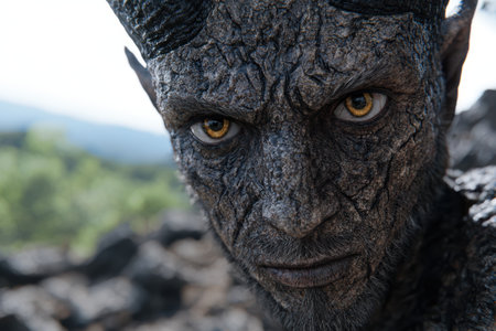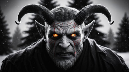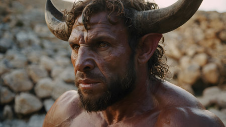 Dramatic close-up of an old bearded devil-like man with horns and detailed facial textures.