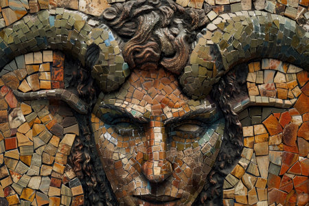 The artwork features a detailed mosaic of a ram-headed figure, emphasizing the skilled craftsmanship and rich textures of the materials used. The vibrant colors enhance its mythical theme.