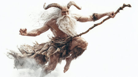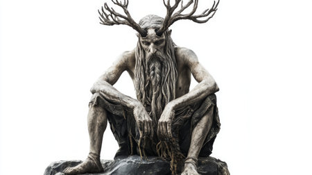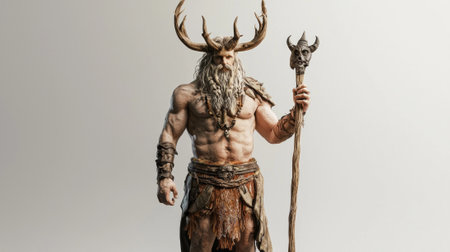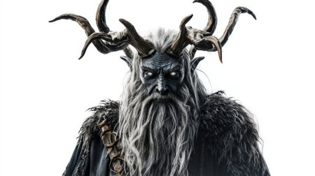 Chernobog the Scandinavian god of darkness is depicted with impressive realism featuring intricate details in his horns beard and clothing against a stark white backdrop.