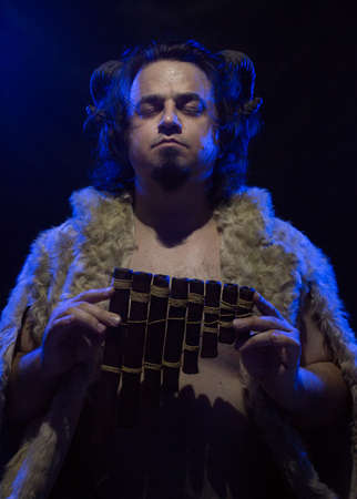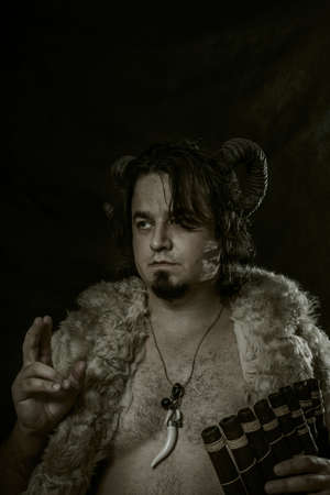 Horned faun with panflute posing over dark background