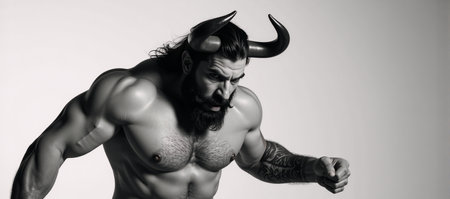 Black-and-white illustration featuring a muscular Minotaur horned and bearded ready for battle